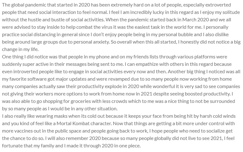 One thing I did notice was that people in my phone and on my friends lists through various platforms were suddenly super active in their messages being sent to me. I can empathize with others in this regard because even introverted people like to engage in social activities every now and then. Another big thing I noticed was all my favorite software got major updates and were revamped due to so many people now working from home many companies actually saw their productivity explode in 2020 while wonderful it is very sad to see companies not giving their workers more options to work from home now in 2021 despite seeing boosted productivity. I was also able to go shopping for groceries with less crowds which to me was a nice thing to not be surrounded by so many people as I would be in any other situation.