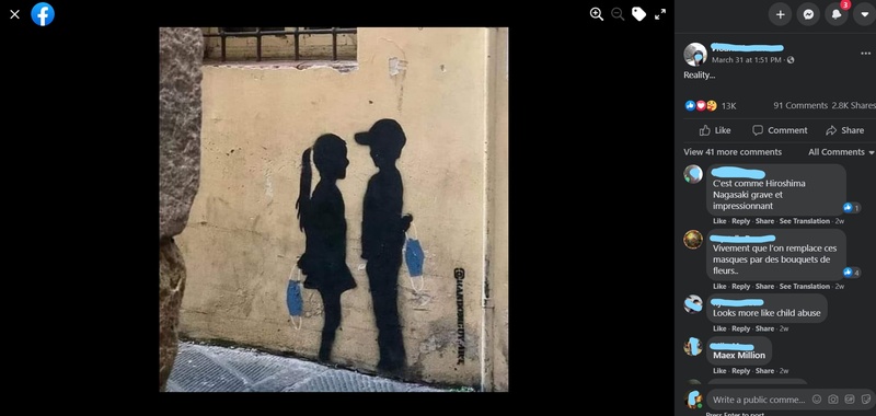Posted in a Banksy fan page on Facebook. Not a Banksy but artist unknown at this point. The OP titled their post "Reality".