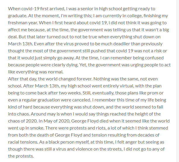 After that day, the world changed forever. Nothing was the same, not even school. After March 13th, my high school went entirely virtual, with the plan being to come back after two weeks. Still, eventually, those plans like prom or even a regular graduation were canceled. I remember this time of my life being kind of hard because everything was shut down, and the world seemed to fall into chaos. Around may is when I would say things reached the height of the chaos of 2020. In May of 2020, George Floyd died when it seemed like the world went up in smoke. There were protests and riots, a lot of which I think stemmed from both the death of George Floyd and tension resulting from decades of racial tensions. As a black person myself, at this time, I felt anger but seeing as though there was still a virus and violence on the streets, I did not go to any of the protests.