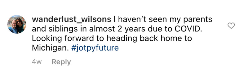 I haven’t seen my parents and siblings in almost 2 years due to COVID. Looking forward to heading back home to Michigan. #jotpyfuture