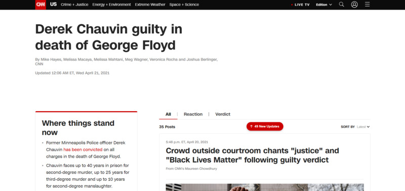 Crowds outside the Minneapolis courtroom and at the location where Floyd was killed chanted "justice" and "Black lives matter" after hearing the verdict.