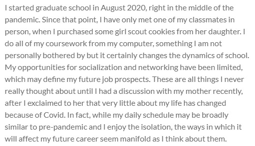 I started graduate school in August 2020, right in the middle of the pandemic. Since that point, I have only met one of my classmates in person, when I purchased some girl scout cookies from her daughter. I do all of my coursework from my computer, something I am not personally bothered by but it certainly changes the dynamics of school. My opportunities for socialization and networking have been limited, which may define my future job prospects. These are all things I never really thought about until I had a discussion with my mother recently, after I exclaimed to her that very little about my life has changed because of Covid. In fact, while my daily schedule may be broadly similar to pre-pandemic and I enjoy the isolation, the ways in which it will affect my future career seem manifold as I think about them.