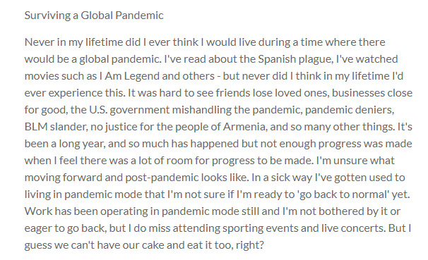 Never in my lifetime did I ever think I would live during a time where there would be a global pandemic. I've read about the Spanish plague, I've watched movies such as I Am Legend and others - but never did I think in my lifetime I'd ever experience this. It was hard to see friends lose loved ones, businesses close for good, the U.S. government mishandling the pandemic, pandemic deniers, BLM slander, no justice for the people of Armenia, and so many other things. It's been a long year, and so much has happened but not enough progress was made when I feel there was a lot of room for progress to be made. I'm unsure what moving forward and post-pandemic looks like. In a sick way I've gotten used to living in pandemic mode that I'm not sure if I'm ready to 'go back to normal' yet. Work has been operating in pandemic mode still and I'm not bothered by it or eager to go back, but I do miss attending sporting events and live concerts. But I guess we can't have our cake and eat it too, right?