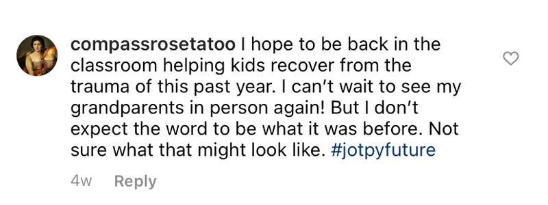hope to be back in the classroom helping kids recover from the trauma of this past year. I can’t wait to see my grandparents in person again! But I don’t expect the word to be what it was before. Not sure what that might look like. #jotpyfuture