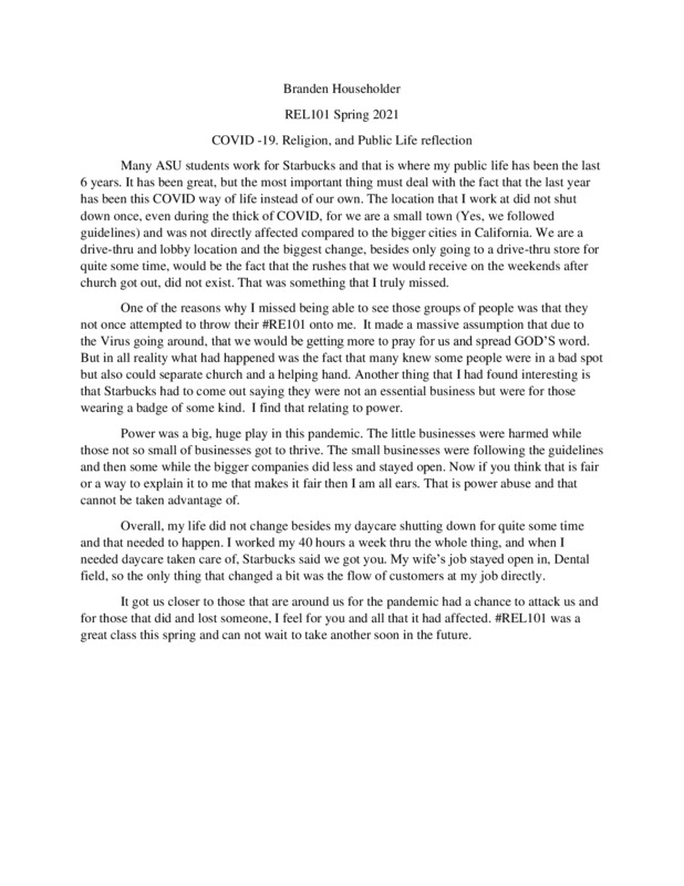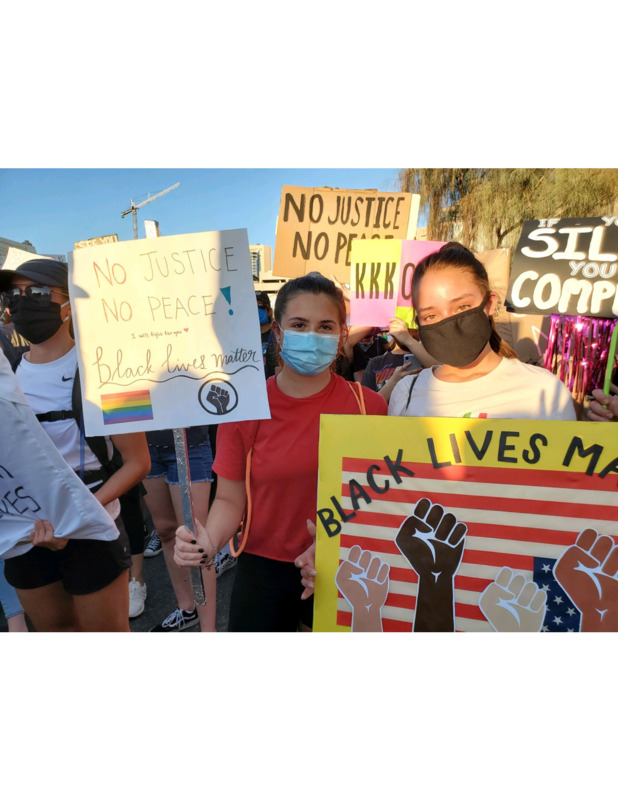 Throughout this past year, COVID-19 has affected each and every person, whether emotionally or physically, but I believe that it also has taught us so much about ourselves and allowed us to empathize with those around us who may be struggling in similar ways. The object I submitted is a photograph of my best friend and myself at a Black Lives Matter protest in Downtown Phoenix on June 3rd, 2020. As the pandemic has forced us to remain at home, it has given me the time to not only focus on personal growth, but also learn more about groups of people that are being oppressed around the world. I have become a more active member in society this past year listening to Black voices by furthering my knowledge on the discriminations they continue to face, and how their experiences of COVID-19 are different from white Americans. This has really opened my eyes to see how many different races are being oppressed, either by being blamed for the occurrence of the pandemic, or by how decisions are made surrounding who deserves priority treatment over another patient on the bias of race, ethnicity, or wealth status. I am grateful to have learned so much about these topics and for being able to attend numerous Black Lives Matter protests, and wish to continue to stand up for what I believe in as an active member in my community. Throughout the pandemic, I believe that relationships within religious communities have strengthened because individuals are looking for even more hope that their loved ones will survive and that everything will be over soon. Religion has played an important role in helping many throughout this difficult time by letting people know they are not alone and have an entire community to support them. Upon working hard to become the best version of myself and really see the world in a more positive manner, I have learned so much about the need for spreading positive energy and support especially to those whose voices were particularly oppressed during this time, or to those who were directly affected by COVID-19. In the midst of this, we must look past our differences and help each other out, because violence and disagreement will not further our progress.