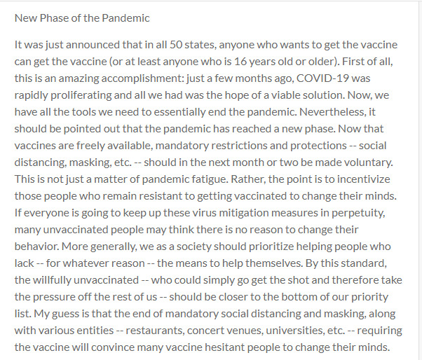 It was just announced that in all 50 states, anyone who wants to get the vaccine can get the vaccine (or at least anyone who is 16 years old or older). First of all, this is an amazing accomplishment: just a few months ago, COVID-19 was rapidly proliferating and all we had was the hope of a viable solution. Now, we have all the tools we need to essentially end the pandemic. Nevertheless, it should be pointed out that the pandemic has reached a new phase. Now that vaccines are freely available, mandatory restrictions and protections -- social distancing, masking, etc. -- should in the next month or two be made voluntary. This is not just a matter of pandemic fatigue. Rather, the point is to incentivize those people who remain resistant to getting vaccinated to change their minds. If everyone is going to keep up these virus mitigation measures in perpetuity, many unvaccinated people may think there is no reason to change their behavior. More generally, we as a society should prioritize helping people who lack -- for whatever reason -- the means to help themselves. By this standard, the willfully unvaccinated -- who could simply go get the shot and therefore take the pressure off the rest of us -- should be closer to the bottom of our priority list. My guess is that the end of mandatory social distancing and masking, along with various entities -- restaurants, concert venues, universities, etc. -- requiring the vaccine will convince many vaccine hesitant people to change their minds.