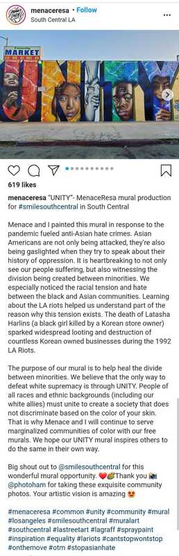 These are screenshots of the Instagram account that represents collaborative artwork by muralists Menace and Resa. The "UNITY" mural is in South Central Los Angeles, California and was done "in response to pandemic fueled anti-Asian hate crimes." The "More Justice, More Peace" mural is in Brooklyn, New York and memorializes Malcolm X and Martin Luther King, Jr. in celebration of Juneteenth.