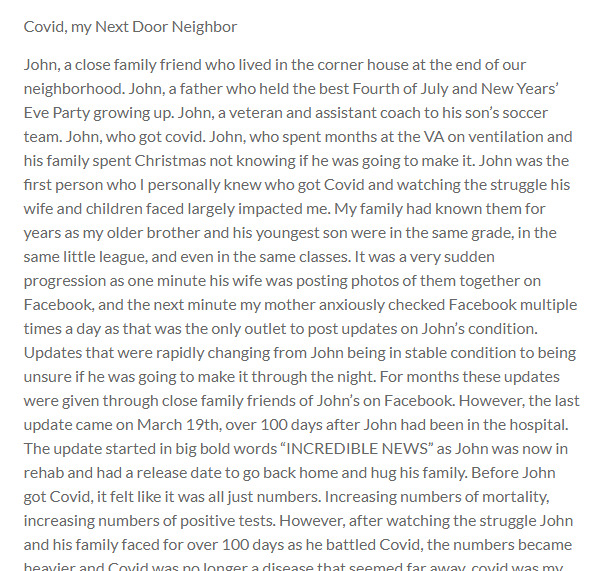 John, a close family friend who lived in the corner house at the end of our neighborhood. John, a father who held the best Fourth of July and New Years’ Eve Party growing up. John, a veteran and assistant coach to his son’s soccer team. John, who got covid. John, who spent months at the VA on ventilation and his family spent Christmas not knowing if he was going to make it. John was the first person who I personally knew who got Covid and watching the struggle his wife and children faced largely impacted me. My family had known them for years as my older brother and his youngest son were in the same grade, in the same little league, and even in the same classes. It was a very sudden progression as one minute his wife was posting photos of them together on Facebook, and the next minute my mother anxiously checked Facebook multiple times a day as that was the only outlet to post updates on John’s condition. Updates that were rapidly changing from John being in stable condition to being unsure if he was going to make it through the night. For months these updates were given through close family friends of John’s on Facebook. However, the last update came on March 19th, over 100 days after John had been in the hospital. The update started in big bold words “INCREDIBLE NEWS” as John was now in rehab and had a release date to go back home and hug his family. Before John got Covid, it felt like it was all just numbers. Increasing numbers of mortality, increasing numbers of positive tests. However, after watching the struggle John and his family faced for over 100 days as he battled Covid, the numbers became heavier and Covid was no longer a disease that seemed far away, covid was my next-door neighbor. The 17,000 people who have passed away from covid in Arizona were just like John, but their family and friends never got an update with incredible news. The weight of Covid has largely impacted everyone from those who have fought Covid, to their loved ones, to their communities. Covid was once something that was promised to go away in two weeks, now it is the root of many families’ struggle and grief.