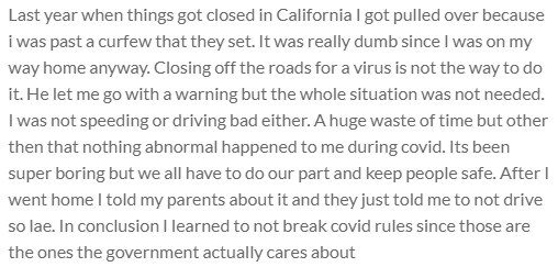 Last year when things got closed in California I got pulled over because i was past a curfew that they set. It was really dumb since I was on my way home anyway. Closing off the roads for a virus is not the way to do it. He let me go with a warning but the whole situation was not needed. I was not speeding or driving bad either. A huge waste of time but other then that nothing abnormal happened to me during covid. Its been super boring but we all have to do our part and keep people safe. After I went home I told my parents about it and they just told me to not drive so lae. In conclusion I learned to not break covid rules since those are the ones the government actually cares about