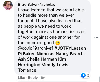 I have learned that we are all able to handle more than we ever thought. I have also learned that as people we need to work together more as humans instead of work against one another for the common good 🙂 @covid19archive1 #JOTPYLesson Pj Baker-Nicholas Nancy Beard-Ash Sheila Harman Kim Herrington Mendy Lewis Torrance