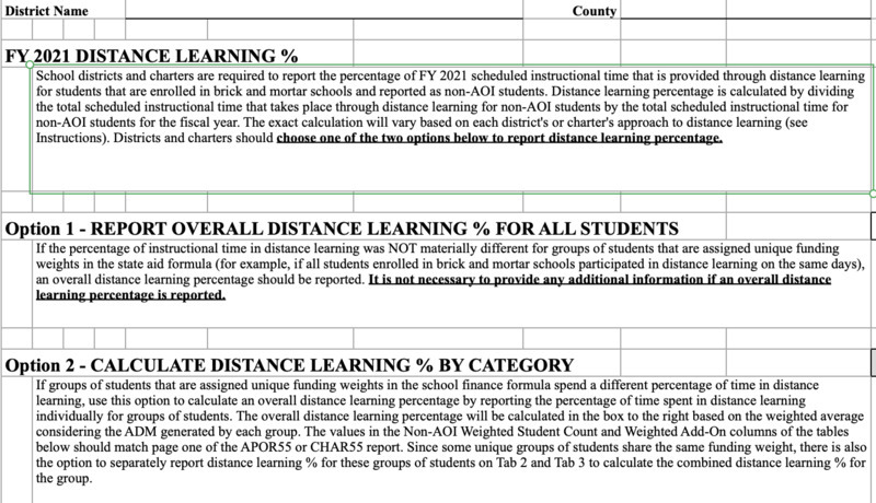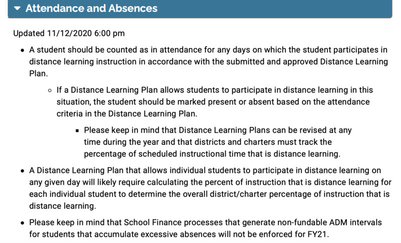 Arizona Department of Education fiscal information and guidance pertaining to attendance and absences while students participate in distance learning. The guidance page also includes links to important forms, school finance reports, and other valuable external resources. According to the report, the due date for a financial plan (Budget/AFR) is November 13, 2020. The name of the file is, "Distance Learning Report -Actual". No recent updates appear to have been made.
