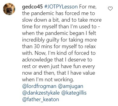 #JOTPYLesson For me, the pandemic has forced me to slow down a bit, and to take more time for myself than I'm used to - when the pandemic began I felt incredibly guilty for taking more than 30 mins for myself to relax with. Now, I'm kind of forced to acknowledge that I deserve to rest or even just have fun every now and then, that I have value when I'm not working. @lordfrogman @amjugan @dankzestykale @kategillis @father_keaton