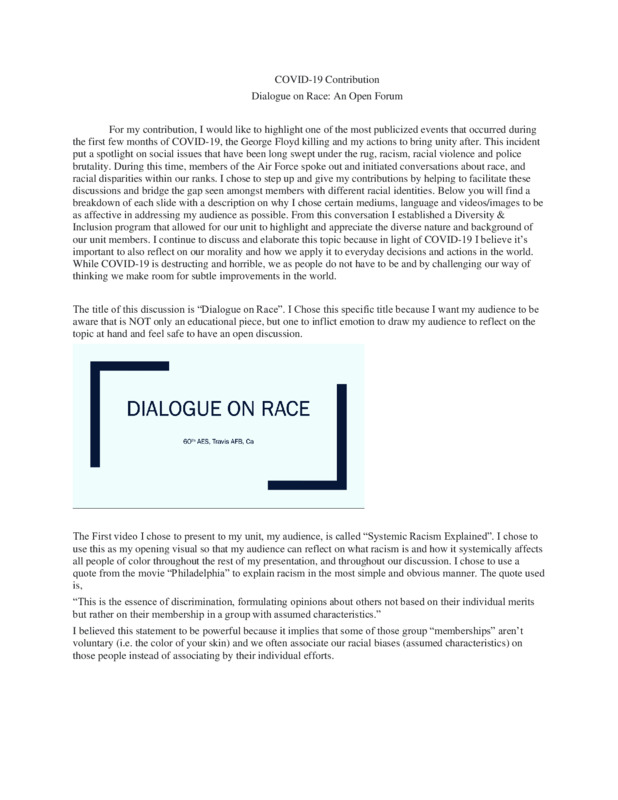 For my contribution, I would like to highlight one of the most publicized events that occurred during the first few months of COVID-19, the George Floyd killing and my actions to bring unity after. This incident put a spotlight on social issues that have been long swept under the rug, racism, racial violence and police brutality. During this time, members of the Air Force spoke out and initiated conversations about race, and racial disparities within our ranks.