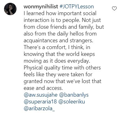 I've learned different ways of continuing communication with my friends and family besides seeing them in person, since all of us are staying home and don't really get a chance to see them face to face in the past year. It's really made me appreciate the friendships that have become strengthened despite quarantine. #JOTPYLesson @a.mlau @how2henry101 @ashes.of.dreams @on_a_kruse @desinistre