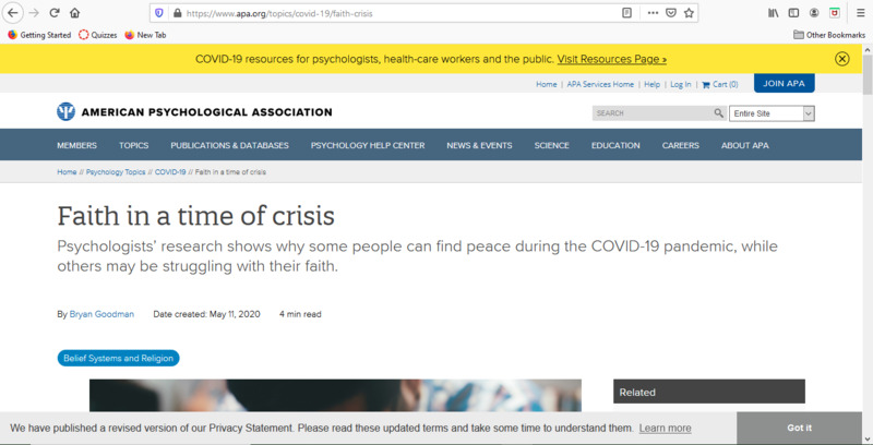 Many people wonder about the benefits religion may or may not have during times of crisis. Is religion a crutch; or, is religion a legitimate way for people re-orient their lives and perspectives during times of crisis? This article from the American Psychology Association answers these questions. Depending on the person and their perspective of their religion, religion can be either positive or negative, perhaps even both at different times. As a result, the answer to the question is not a simple yes or no. However, even for the agnostic or the atheist, as the article describes, there are many religious and spiritual rituals one can engage with (e.g. yoga, meditation, etc.).