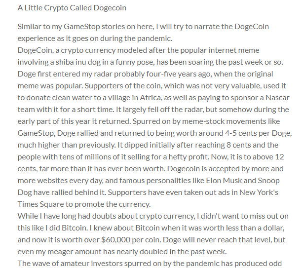 Similar to my GameStop stories on here, I will try to narrate the DogeCoin experience as it goes on during the pandemic.