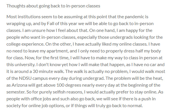 Most institutions seem to be assuming at this point that the pandemic is wrapping up, and by Fall of this year we will be able to go back to in-person classes. I am unsure how I feel about that. On one hand, I am happy for the people who want in-person classes, especially those undergrads looking for the college experience. On the other, I have actually liked my online classes. I have no need to leave my apartment, and I only need to properly dress half my body for class. Now, for the first time, I will have to make my way to class in person at this university. I don't know yet how I will make that happen, as I have no car and it is around a 30 minute walk. The walk is actually no problem, I would walk most of the NDSU campus every day during undergrad. The problem will be the heat, as Arizona will get above 100 degrees nearly every day at the beginning of the semester. So for purely selfish reasons, I would actually prefer to stay online. As people with office jobs and such also go back, we will see if there is a push in society for online job options, or if things will truly go back to normal.