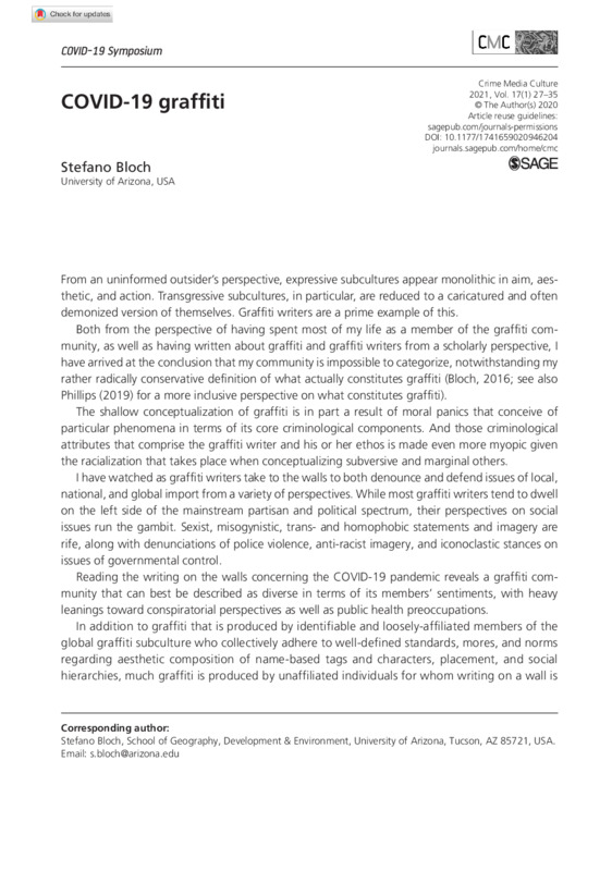 "MAPPING COVID-19 STREET ART: Artists and writers producing work in the streets – including tags, graffiti, murals, stickers, and other installations on walls, pavement, and signs – are in a unique position to respond quickly and effectively in a moment of crisis. Street art’s ephemeral nature serves to reveal very immediate and sometimes fleeting responses, often in a manner that can be raw and direct. At the same time, in the context of a crisis, street art also has the potential to transform urban space and foster a sustained political dialogue, reaching a wide audience, particularly when museums and galleries are shuttered. For all of these reasons, it is not surprising to see an explosion of street art around the world created in response to the Covid-19 global pandemic, even as our movement in public spaces is limited due to public health concerns."
