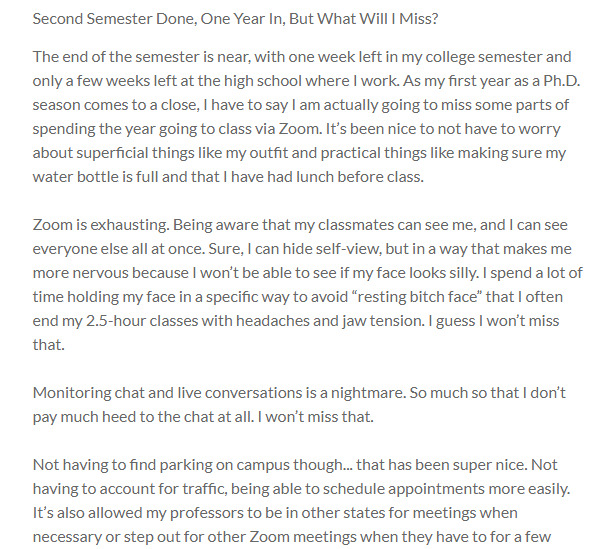 The end of the semester is near, with one week left in my college semester and only a few weeks left at the high school where I work. As my first year as a Ph.D. season comes to a close, I have to say I am actually going to miss some parts of spending the year going to class via Zoom. It’s been nice to not have to worry about superficial things like my outfit and practical things like making sure my water bottle is full and that I have had lunch before class.
