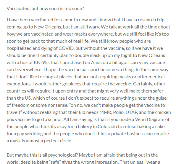 I have been vaccinated for a month now and I know that I have a research trip coming up to New Orleans, but I am still wary. We talk at work all the time about how we are vaccinated and wear masks everywhere, but we still feel like it’s too soon to get back to that much of real life. We still know people who are hospitalized and dying of COVID, but without the vaccine, so if we have it we should be fine? I certainly plan to double mask up on my flight to New Orleans with a box of KN-95s that I purchased on Amazon a bit ago. I carry my vaccine card everywhere; I hope the vaccine passport becomes a thing. In the same way that I don’t like to shop at places that are not requiring masks or offer medical exemptions, I would rather go places that require the vaccine. Certainly, other countries will require it upon entry and that might very well make them safer than the US, which of course I don’t expect to require anything under the guise of freedom or some nonsense. “oh no, we can’t make people get the vaccine to travel!” without realizing that their kid needs MMR, Polio, DTAP, and the chicken pox vaccine to go to school. All I am saying is that if you made a Venn Diagram of the people who think its okay for a bakery in Colorado to refuse baking a cake for a gay wedding and the people who don’t think a private business can require a mask is almost a perfect circle.
