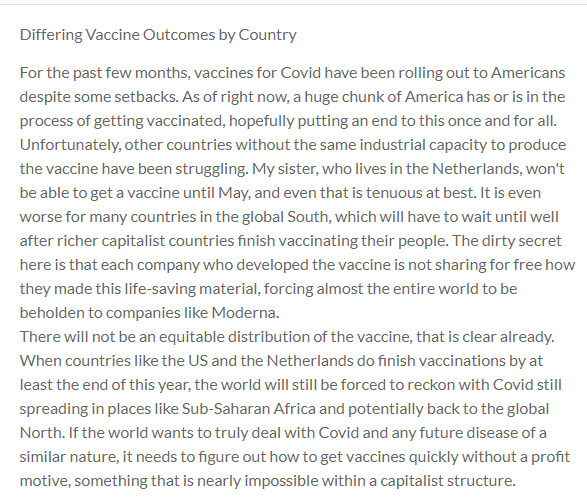 For the past few months, vaccines for Covid have been rolling out to Americans despite some setbacks. As of right now, a huge chunk of America has or is in the process of getting vaccinated, hopefully putting an end to this once and for all. Unfortunately, other countries without the same industrial capacity to produce the vaccine have been struggling. My sister, who lives in the Netherlands, won't be able to get a vaccine until May, and even that is tenuous at best. It is even worse for many countries in the global South, which will have to wait until well after richer capitalist countries finish vaccinating their people. The dirty secret here is that each company who developed the vaccine is not sharing for free how they made this life-saving material, forcing almost the entire world to be beholden to companies like Moderna.