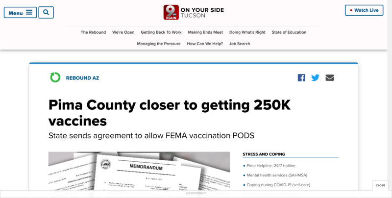 TUCSON, Ariz. (KGUN) — Pima County is now a step closer to FEMA setting up vaccination PODS and bringing in about a quarter million doses.