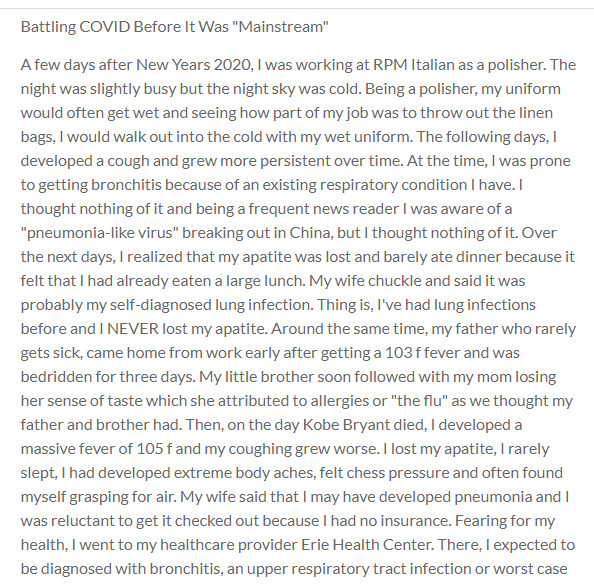 A few days after New Years 2020, I was working at RPM Italian as a polisher. The night was slightly busy but the night sky was cold. Being a polisher, my uniform would often get wet and seeing how part of my job was to throw out the linen bags, I would walk out into the cold with my wet uniform. The following days, I developed a cough and grew more persistent over time. At the time, I was prone to getting bronchitis because of an existing respiratory condition I have. I thought nothing of it and being a frequent news reader I was aware of a "pneumonia-like virus" breaking out in China, but I thought nothing of it. Over the next days, I realized that my apatite was lost and barely ate dinner because it felt that I had already eaten a large lunch. My wife chuckle and said it was probably my self-diagnosed lung infection. Thing is, I've had lung infections before and I NEVER lost my apatite. Around the same time, my father who rarely gets sick, came home from work early after getting a 103 f fever and was bedridden for three days. My little brother soon followed with my mom losing her sense of taste which she attributed to allergies or "the flu" as we thought my father and brother had. Then, on the day Kobe Bryant died, I developed a massive fever of 105 f and my coughing grew worse. I lost my apatite, I rarely slept, I had developed extreme body aches, felt chess pressure and often found myself grasping for air. My wife said that I may have developed pneumonia and I was reluctant to get it checked out because I had no insurance. Fearing for my health, I went to my healthcare provider Erie Health Center. There, I expected to be diagnosed with bronchitis, an upper respiratory tract infection or worst case scenario pneumonia. However, when the doctor saw my condition and heard my symptoms he said that it wasn't: pneumonia, bronchitis or a lung infection. Baffled I said then what do I have and he responded with: "mhmmmmm do you have asthma?" I said I did when I was younger but I out grew it. His response: "That's it. It's asthma". Unsatisfied, I said its not it because I haven't had any asthma complications in over a decade. He later said that a lung operation I had when I was three days old might be the culprit. Once again, I questioned it. He conceded and asked if I wanted to get x-rays done. I agreed and went to Northwestern Medical Center with Erie covering the costs. I got my x-rays done and I decided to go have lunch with my wife. Then, I started coughing, lost my apatite and developed a fever. We took an uber and went home were I collapsed on my bed and was knocked out cold in a nice sleep for 20 hours. The cough never went away until late February when talks of a potential lockdown to contain COVID was being discussed. I never thought much of what I had that winter until my mom got an anti-body test where she came out positive for the anti-bodies. The same day we watched a COVID special on Netflix and they highlighted the COVID symptoms. The ones that stuck out to me was: loss of apatite, chest pressure, fatigue, coughing, short-breaths, fever and trouble focusing. I clicked everything and realized: "Holy shit. I must've had COVID before it was cool" (ironically). Ever since my illness as I described, my mind has become more "foggy" with me having trouble focusing, remembering and even stuttering more often. Trouble focusing has been mentioned as a COVID complication in your post-battle with the infection. Fast forward to February 2021, I went back to Erie to get my yearly physical done expecting to hear my sugar levels were off the charts. Except, my doctor walked in and first thing he said was: "so you had problems breathing in last year January?" I gave him a stare and asked "you don't think that I had..." and he interrupted and said "sir, you either had COVID before we knew what it was or you had some exotic virus" mentioning the latter in a sarcastic tone. There I realized, how chill I took COVID and literally brushed it off multiple times as a lung infection and nothing serious when in reality it was. Had I known what I had was COVID at the time that I had it, I would have been panicking and picturing death at my door. Often, your mindset can be just as dangerous as the illness itself.