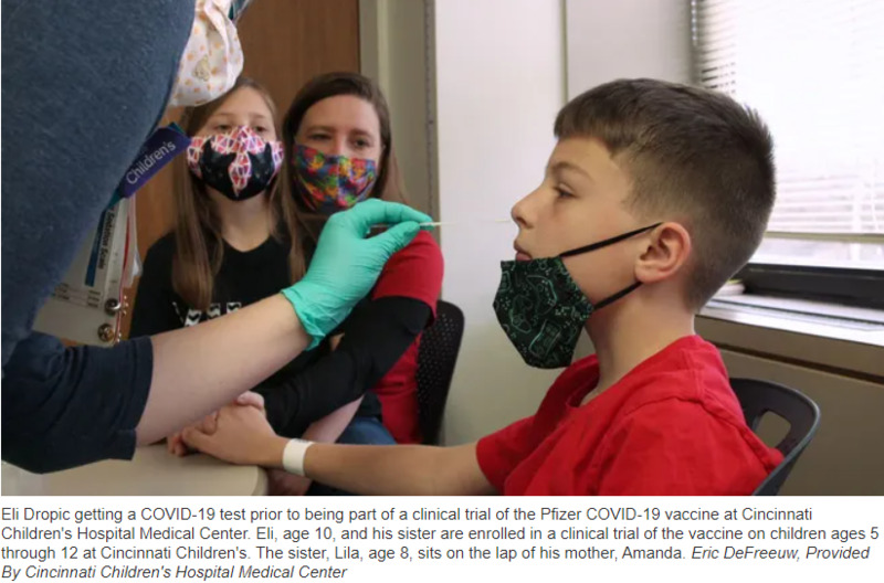 This article speaks about the clinical trials that have begun in Cincinnati Children's Hospital Medical Center in hopes of getting a vaccine out for children as young as five years old. At the moment about 3,000 children have been on a waitlist to be involved in the trial. There are sites at which people are working to get dosage limits right for children ranging from 2-4 aswell. Many responses were collected by children on how they felt about being a part of the trial. Lila, a third-grader who is 8, was asked what was the best thing about participating in the vaccine trial, she replied, "knowing I might be able to not wear my mask anymore and knowing that the coronavirus vaccine is coming out." The effects the pandemic has on the children are visible as their hopes are to help the pandemic stop so that things go back to normal for them.