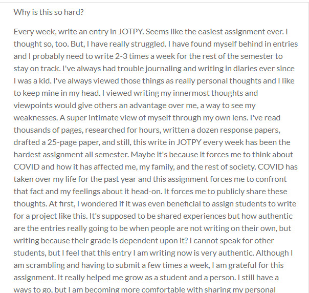 Every week, write an entry in JOTPY. Seems like the easiest assignment ever. I thought so, too. But, I have really struggled. I have found myself behind in entries and I probably need to write 2-3 times a week for the rest of the semester to stay on track. I've always had trouble journaling and writing in diaries ever since I was a kid. I've always viewed those things as really personal thoughts and I like to keep mine in my head. I viewed writing my innermost thoughts and viewpoints would give others an advantage over me, a way to see my weaknesses. A super intimate view of myself through my own lens. I've read thousands of pages, researched for hours, written a dozen response papers, drafted a 25-page paper, and still, this write in JOTPY every week has been the hardest assignment all semester. Maybe it's because it forces me to think about COVID and how it has affected me, my family, and the rest of society. COVID has taken over my life for the past year and this assignment forces me to confront that fact and my feelings about it head-on. It forces me to publicly share these thoughts. At first, I wondered if it was even beneficial to assign students to write for a project like this. It's supposed to be shared experiences but how authentic are the entries really going to be when people are not writing on their own, but writing because their grade is dependent upon it? I cannot speak for other students, but I feel that this entry I am writing now is very authentic. Although I am scrambling and having to submit a few times a week, I am grateful for this assignment. It really helped me grow as a student and a person. I still have a ways to go, but I am becoming more comfortable with sharing my personal thoughts and opinions in writing.