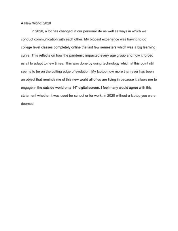 In 2020, a lot has changed in our personal life as well as ways in which we conduct communication with each other. My biggest experience was having to do college level classes completely online the last few semesters which was a big learning curve. This reflects on how the pandemic impacted every age group and how it forced us all to adapt to new times. This was done by using technology which at this point still seems to be on the cutting edge of evolution. My laptop now more than ever has been an object that reminds me of this new world all of us are living in because it allows me to engage in the outside world on a 14" digital screen. I feel many would agree with this statement whether it was used for school or for work, in 2020 without a laptop you were doomed.