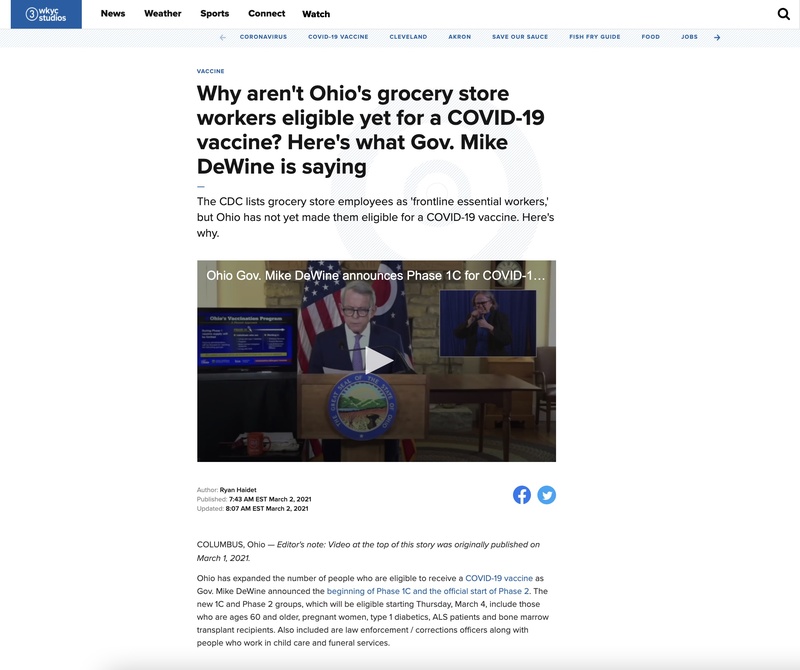 Despite grocery store workers being essential frontline workers and a part of the CDC's vaccination recommendations, they were not given access to the vaccine in Ohio until it was open to everyone over the age of 16. While Governor DeWine insisted that age was the most important factor in determining vaccination eligibility, he neglected to realize the amount of exposure these essential workers were encountering daily. Also left out of earlier access to vaccines were public transportation workers, food and travel workers, U.S. Postal Service workers, and manufacturing workers. The vaccine is available to any Ohio resident over the age of 16 as of March 29th, but in more populated areas there have been issues with registration and long waits for the first dose. Including more occupations in the rollout of vaccines may not have prevented these issues from happening, but it could have ensured that those enduring more consistent exposure would have an easier time getting the vaccine, as they would not be battling the rest of the population for an appointment.