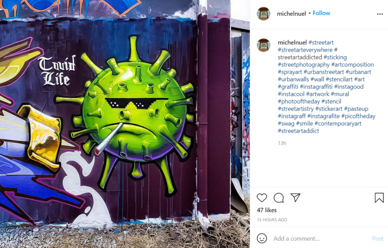 Photographer Michel Nuel posted this street art of the Corona virus smoking.