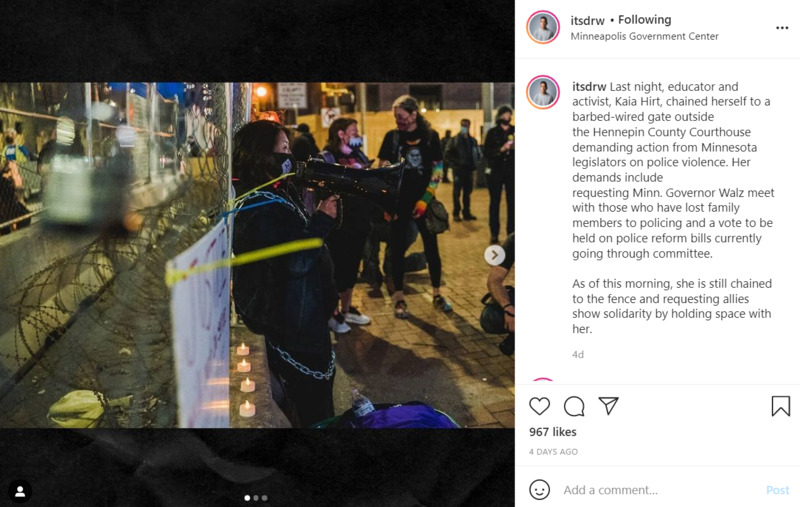 Last night, educator and activist, Kaia Hirt, chained herself to a barbed-wired gate outside the Hennepin County Courthouse demanding action from Minnesota legislators on police violence. Her demands include requesting Minn. Governor Walz meet with those who have lost family members to policing and a vote to be held on police reform bills currently going through committee.