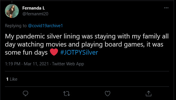 My pandemic silver lining was staying with my family all day watching movies and playing board games, it was some fun days Red heart #JOTPYSilver