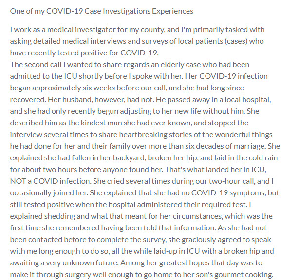 I work as a medical investigator for my county, and I'm primarily tasked with asking detailed medical interviews and surveys of local patients (cases) who have recently tested positive for COVID-19.