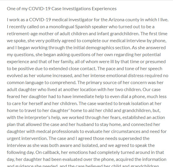 I work as a COVID-19 medical investigator for the Arizona county in which I live. I recently called on a monolingual Spanish speaker who turned out to be a retirement-age mother of adult children and infant grandchildren. The first time we spoke, she very politely agreed to complete our medical interview by phone, and I began working through the initial demographics section. As she answered my questions, she began asking questions of her own regarding her potential experience and that of her family, all of whom were ill by that time or presumed to be positive due to extended close contact. The pace and tone of her speech evolved as her volume increased, and her intense emotional distress required no common language to comprehend. The primary source of her concern was her adult daughter who lived at another location with her two children. Our case feared her daughter had to have immediate help to even dial a phone, much less to care for herself and her children. The case wanted to break isolation at her home to travel to her daughter' home to aid her child and grandchildren, but, with the interpreter's help, we worked through her fears, established an action plan that allowed the case and her husband to stay home, and connected her daughter with medcal professionals to evaluate her circumstances and need for urgent intervention. The case and I agreed those needs superseded the interview as she was both aware and isolated, and we agreed to speak the following day. On callback, her emotions had completely turned around in that day, her daughter had been evaluated over the phone, acquired the information and guidance she needed, and the case believed her child and grandchildren were now safe and well. Throughout the roughly 90-minute translated interview, she repeatedly expressed her gratitude for our having called and helped her family and information and guidance. Despite the number of times our patients/cases have expressed anger, outrage, suspicion, or worse at our medical investigation and contact tracing efforts, this series of calls made them worthwhile.