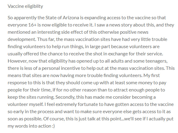 So apparently the State of Arizona is expanding access to the vaccine so that everyone 16+ is now eligible to receive it. I saw a news story about this, and they mentioned an interesting side effect of this otherwise positive news development. Thus far, the mass vaccination sites have had very little trouble finding volunteers to help run things, in large part because volunteers are usually offered the chance to receive the shot in exchange for their service. However, now that eligibility has opened up to all adults and some teenagers, there is less of a personal incentive to help out at the mass vaccination sites. This means that sites are now having more trouble finding volunteers. My first response to this is that they should come up with at least some money to pay people for their time, if for no other reason than to attract enough people to keep the sites running. Secondly, this has made me consider becoming a volunteer myself. I feel extremely fortunate to have gotten access to the vaccine so early in the process and want to make sure everyone else gets access to it as soon as possible. Of course, this is just talk at this point...we'll see if I actually put my words into action :)