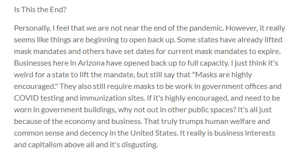 Personally, I feel that we are not near the end of the pandemic. However, it really seems like things are beginning to open back up. Some states have already lifted mask mandates and others have set dates for current mask mandates to expire. Businesses here in Arizona have opened back up to full capacity. I just think it's weird for a state to lift the mandate, but still say that "Masks are highly encouraged." They also still require masks to be work in government offices and COVID testing and immunization sites. If it's highly encouraged, and need to be worn in government buildings, why not out in other public spaces? It's all just because of the economy and business. That truly trumps human welfare and common sense and decency in the United States. It really is business interests and capitalism above all and it's disgusting.