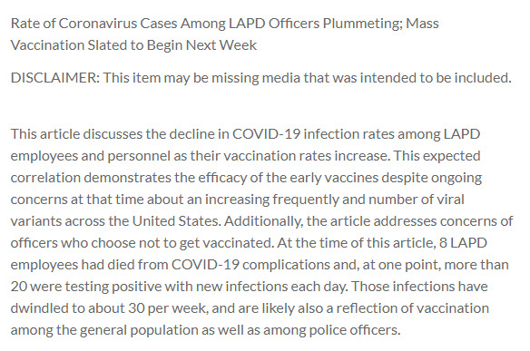 This article discusses the decline in COVID-19 infection rates among LAPD employees and personnel as their vaccination rates increase. This expected correlation demonstrates the efficacy of the early vaccines despite ongoing concerns at that time about an increasing frequently and number of viral variants across the United States. Additionally, the article addresses concerns of officers who choose not to get vaccinated. At the time of this article, 8 LAPD employees had died from COVID-19 complications and, at one point, more than 20 were testing positive with new infections each day. Those infections have dwindled to about 30 per week, and are likely also a reflection of vaccination among the general population as well as among police officers.