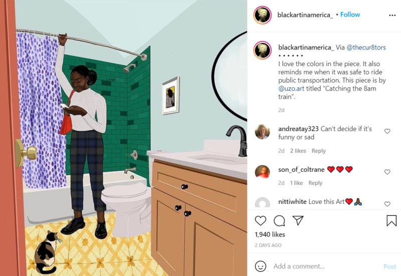 I love the colors in the piece. It also reminds me when it was safe to ride public transportation. This piece is by @uzo.art titled “Catching the 8am train”.