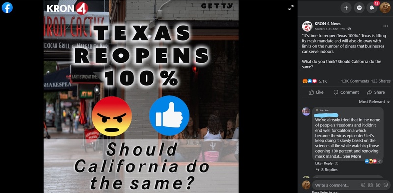 From Kron4 News: “It’s time to reopen Texas 100%.” Texas is lifting its mask mandate and will also do away with limits on the number of diners that businesses can serve indoors. What do you think? Should California do the same? -