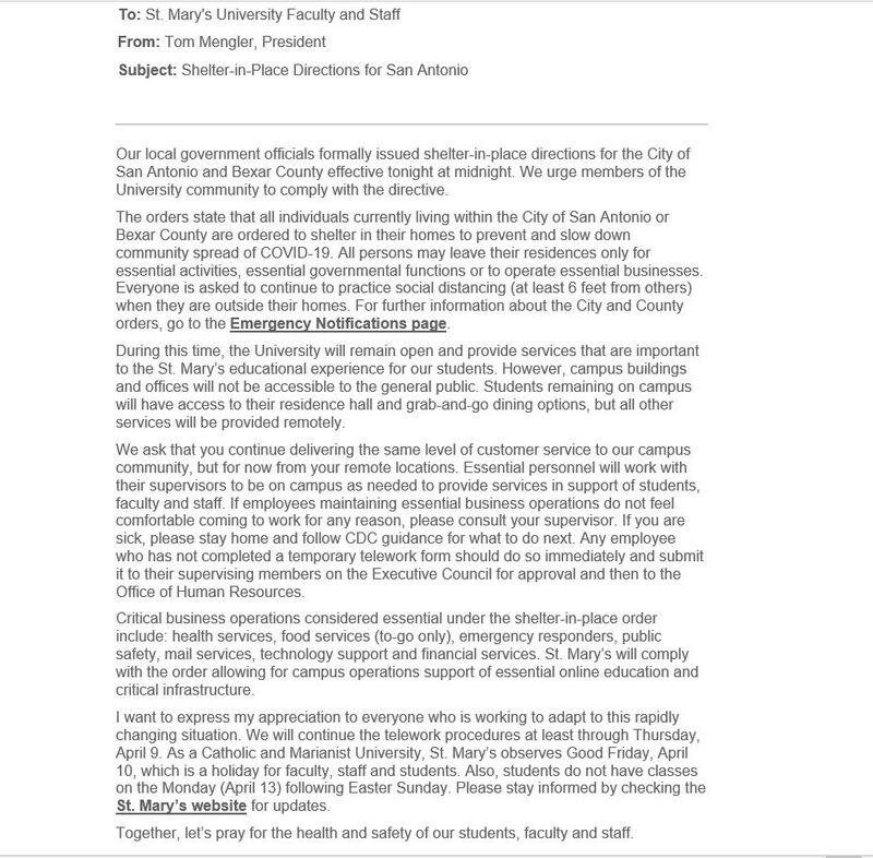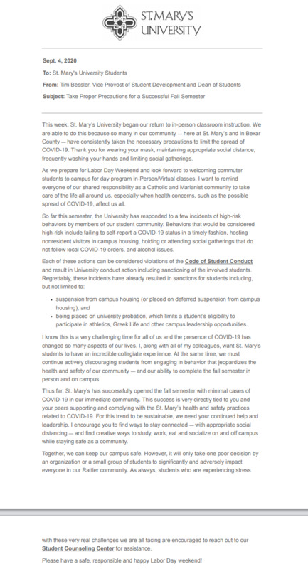 St. Mary's University is a liberal arts university in San Antonio, Texas. After its March 2020 spring break, the university transitioned into online learning in response to the pandemic. For the Fall 2020 semester, St. Mary's has worked to maintain university traditions, services, and programs within COVID-19 precautions.