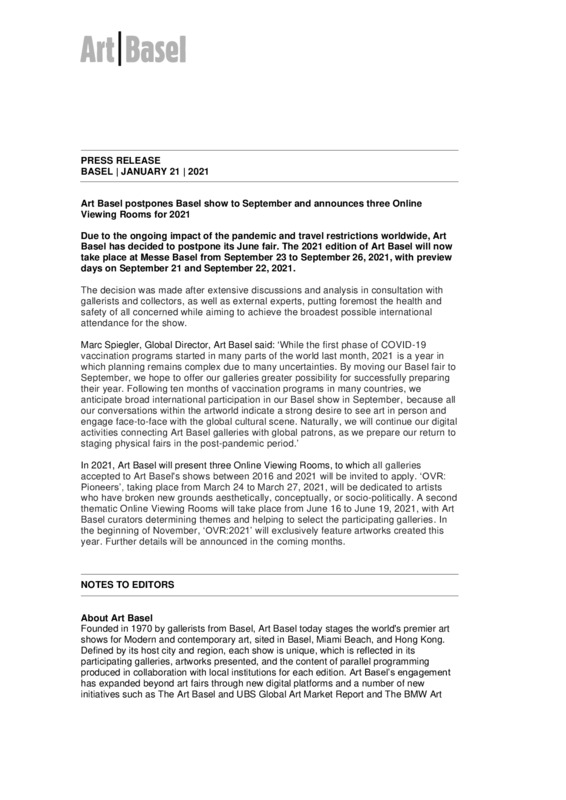 "Art Basel postpones Basel show to September and announces three Online Viewing Rooms for 2021"