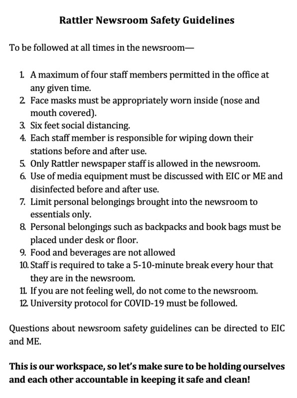Though many members of staff and faculty have found working and teaching more complicated than ever before, the students and faculty working on the Rattler seem to have found a way to manage this, continuing to allow for productivity on the periodical while maintaining practices to ensure the safety of employees, student or otherwise. Aside from following generally accepted guidelines, such as helping employees maintain safe distances while in the office workspaces to minimize potential risk of unwanted or dangerous transmission the Rattler strove to give the student body ways to cope as well.