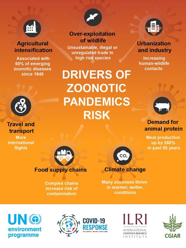 "This is a tweet from the UN Environment Programme showing the driving factors behind zoonotic diseases and pandemics. Humans' abuse of the environment is to blame."