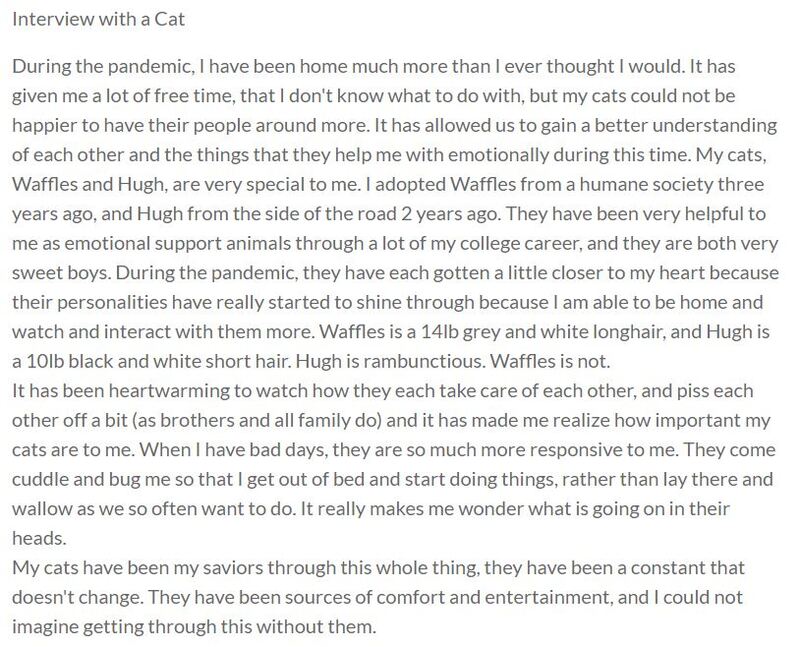 Anecdotal evidence as well as scientific studies support pet owners' assertions that our animals provide us with incredible mental and emotional support. For many, the isolation of the pandemic would have been much worse without an animal companion. This page is dedicated to stories about pets' effect on mental health.