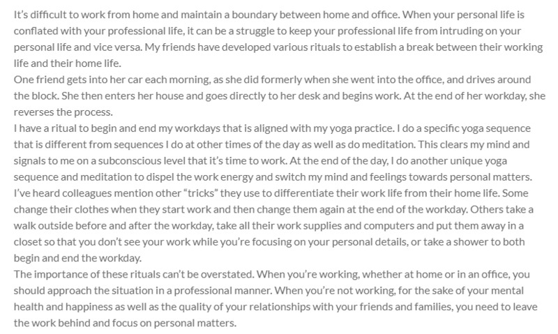 "When your personal life is conflated with your professional life, it can be a struggle to keep your professional life from intruding on your personal life and vice versa." Developing rituals to provide a boundary between work and home, even though they are now in the same physical space, was crucial to maintaining a good work/life balance.