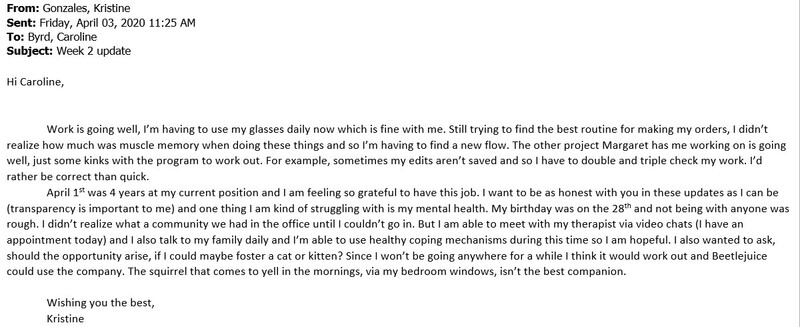 "I'm having to find a new flow ... I didn't realize what a community we had in the office until I couldn't go in ... One thing I'm kind of struggling with is my mental health."