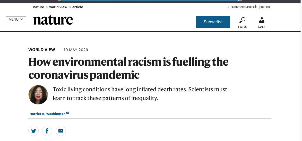 News about the disproportionate death rates among the black community has been unnerving to many people, including myself. Why is this the case? In this article, Harriet Washington explores how environmental racism has contributed to this due to poverty, access to health care, and living conditions, among other factors. White privilege is sweeping, and I have certainly benefited from it in too many ways to name. I think it's important for all white people to use the power of their privilege to lift the voices of marginalized people and advocate for the reforms necessary to ameliorate injustices and inequalities.