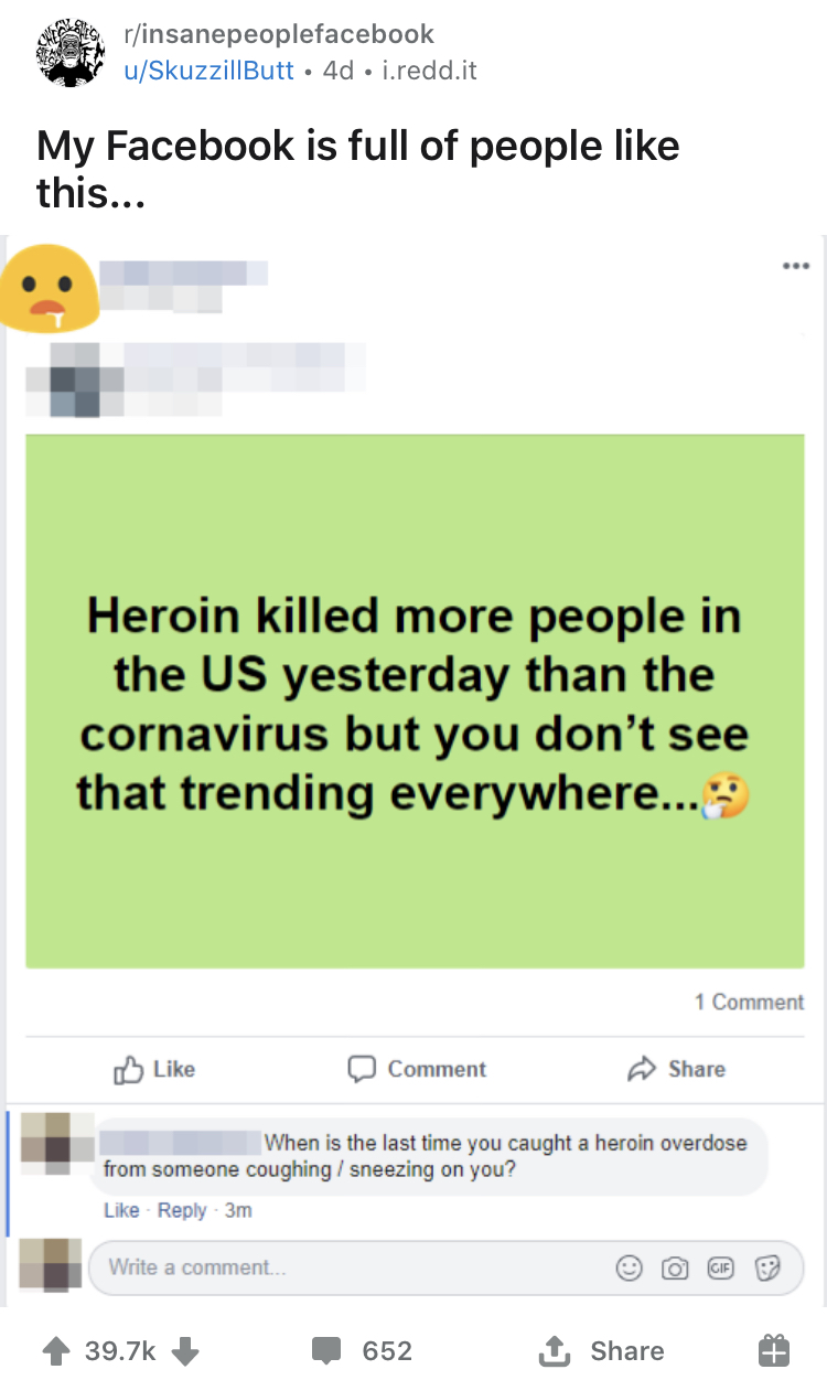 COVID-19 skeptics argue that the death rate of COVID is exaggerated in comparison to other causes of death. This post argues that heroin is a bigger killer but is being ignored. The commenter rebukes this by asking the last time someone caught a heroin overdose from a sneeze or cough. This was shared on http://reddit.com/r/insanepeoplefacebook by a person who laments their Facebook feed is full of petiole who think like the overdose poster.